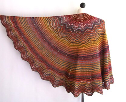 his top down, half circle shawl uses two shades of Cascade’s Mellila fingering yarn to create stripes and eyelets. With an I-cord along the wingspan, which is worked as you knit through the pattern.