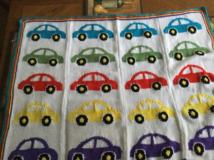 If you wish to make each of the twenty cars on the blanket in a different colour, you will need 35 m/35 yds in MC, 20 m/20yds in CC, 5 m/5 yds in black and yellow per motif. To knit the border in a single colour, you will require 165 m/190 yds of your desired yarn.