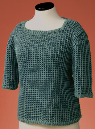 I love the slip stitch pattern in this sweater! I used a darker yarn as the background, to make the foreground really stand out. The square neckline looks great on anyone, and it complements the geometric nature of the stitch pattern. You can work the sweater up in the short sleeve version shown below, or opt for long sleeves instead. The stitch pattern is a mosaic pattern. You only ever work with one color at a time, slipping the stitches that you will work in the other color on the following two rows.