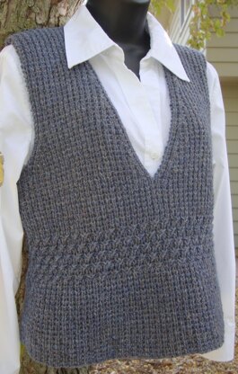 V- neck vest uses a "cluster" pattern stitch at the waist to create a more fitted look.
