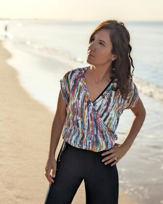 The top is knitted flat in three parts corresponding to the three sections: back, right front and left front. The knitting direction is horizontal, starting at the sleeve and moving towards the body as also detailed in the sketch provided.