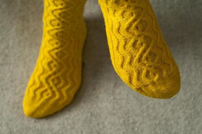 This top-down cabled sock is engaging but not too difficult to knit, and the sunny colour will cheer up the dullest winter days.