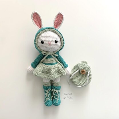 The Wanderlust Bunny is a fun amigurumi rabbit doll that loves to travel and explore the world. She wears a sweater, knee-high socks, tall boots, and has several removable accessories, including a hood, skirt, and backpack. This toy is perfect for kids and children who love dress-up and pretend play. The PDF pattern file includes complete, written instructions for the doll-making process and step-by-step explanations for finishing details.