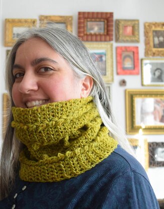 This cabled cowl makes a bold statement with just one skein. The snug fit is perfect for keeping out the wind on a cold day.