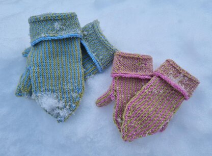 Warm mittens for children knitted in a traditional Scandinavian twined knitting technique. Two strands of yarn alternately knitting and twisting between each and every stitch. The resulting fabric is thicker, firmer and less elastic than regular knitting but also warmer and more wind-resistant - perfect for mittens.