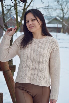 Sweater is worked from the top down. The construction starts at the shoulders, with some short rows. The back and the fronts are worked separately up to the armholes, and then everything is joined to complete the body in one piece. The sleeves are picked up around the armholes and also worked in the round.