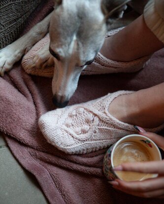 ConstructionThese socks are toe up constructed. The heel is constructed with short rows and at the same time as the leg. To best choose your slipper size, select according to the circumference of foot’s sole. The length of the foot is totally adaptable. The slippers are worn with a zero ease of -2 to 2cm (- 1/2 to +1/2’’) (length AND sole circumference) depending on the use you will make of them (over socks or barefoot).