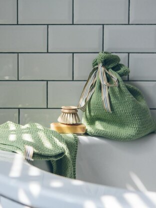From the Knit Rowan website: Knit this homeware washbag and facecloth set from 10 Simple Projects for Cosy Homes. Designed by Sarah Hatton using our ever popular yarn Handknit Cotton (cotton), both are knitted in stocking stitch with a garter stitch edging.