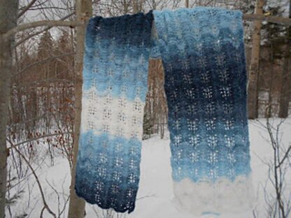 This delicately, rippled scarf is very warm and cozy. It is knitted in an acrylic, mohair, and wool blend yarn that is lace weight, yet fuzzy and cuddly. The ripple pattern is easy to follow and to memorize for a great quick-knitted accessory to your warm winter knits. There are written as well as charted directions. The yarn used does the color-changing work for you!