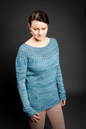 This would be perfect pattern for first sweater. Skill level is advanced beginner, the garment is worked seamlessly from top down. Some level of circular knitting should be mastered.