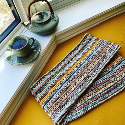 Finished size: 60 inch/153 cm loop, 7.5 inches/19 cm wide as written. It is easily made into a single loop by starting with half the number of stitches, and can be made wider or narrower with more or fewer repeats, to your preference.
