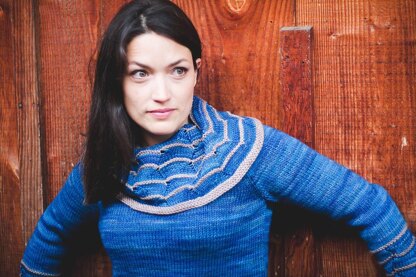 Basic knitting skills, knitting in the round (for the cowl), increases/decreases, working from simple lace chart or written instructions, knit-on edging, knowledge of basic sweater construction, picking up stitches, seaming.