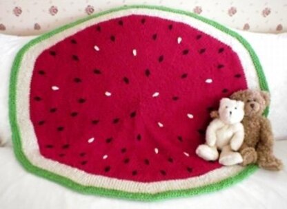 About the Design: This adorable baby blanket is knit with doubled strands of Cascade Yarns Eco+ Peruvian wool yarn. This yarn is soft enough for a baby and comes in huge 8.75 oz. hanks, so there’s far fewer ends to weave in! The easy-to-knit watermelon shape is knit in the round, from the center out, into a large circle. Short rows turn the circle into an oval. The watermelon seeds are embroidered on last. What baby wouldn’t look even more precious lying under or on top of this blanket!