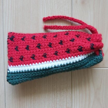 - Example pouch uses yarn in the line “Canadiana” in 100g skeins by Patons. This line of yarn is on the thinner side of medium weight yarn.