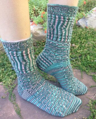 These socks start sideways with moons waxing and waning. Stitches are picked up for the cuff and then for the leg with lace that moves back and forth, highlighting the variegated yarn.