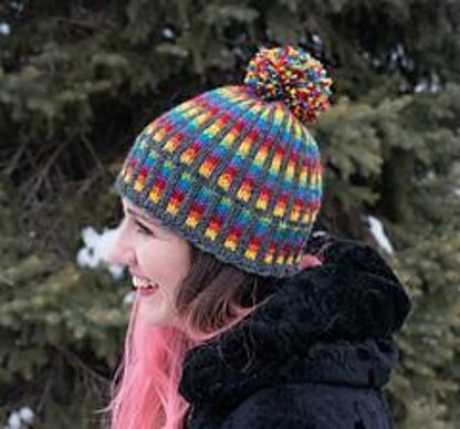 Well, 4 years later, I decided to work up a rainbow striped hat and I love the way it turned out. Last year, I donated all sales of the Trevor Hat to the Trevor Project, and I will do the same for this design. The hat is designed to be worn with negative ease, and the nature of corrugated ribbing and stockinette is that it will pull in quite a bit. Keep your floats loose.