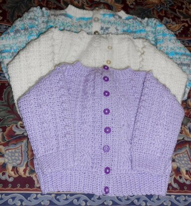 Aran style cardigan with hat in 4 infant and baby sizes.