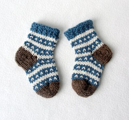 Sweet little color work sock pattern for baby boys and girls. Seamless styled toes and heels. Quick and easy little accessory to coordinate with unisex outfits. A fun and useful way to use up small bits of yarn.