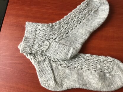 "Weeping Angel" is a lace sock, knit from the top down to emulate the wings of stone angels. I am providing it in one size, but it can be shrunk or enlarged by altering gauge. This sock fits my ladies' size 9.5 feet (average width) snugly, but has cling and stretch due to the lace pattern. Rather small-footed folks may wish to go down a needle size or two and use finer yarn.
