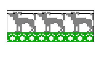 This pattern consists of two Weimaraner charts and is the result of a pattern request. The standing dog goes over 18 stitches and the face close-up goes over 16 stitches. Two different peerie patterns (bones and paws) are also included in the pattern.