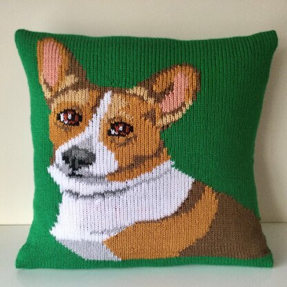 Knitted cushion cover pattern featuring a handsome Welsh Corgi!