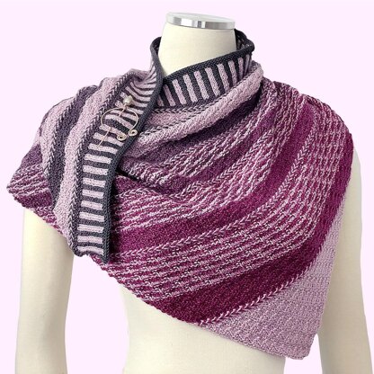 This asymmetric triangular shawl is worked flat from the bottom point up, starting with just 3 stitches. It features a simple stitch pattern in combination with a gradient mini-skein color progression, Latvian braids, and a corrugated ribbing finish to produce a complex-looking texture that is surprisingly easy to knit.