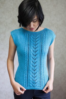 Whakamarie is a drop sleeve top with a center panel comprising of lace and cables on the front side. Waist shaping adds a flattering silhouette. The bottom portion of the top, depending on your measurements, may have negative to no ease, but the bust area allows for 4” of positive ease. Stitches are picking up for the arm bands for I-cord finishing and at the bottom of the garment, for the ribbing. Pattern includes instructions for knitting this both flat and in the round as well as instructions for lengthening the top.