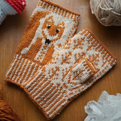 These cozy What The Fox Fingerless Mittens blend traditional Norwegian Selbu-style knitting with a whimsical woodland twist. These stranded colorwork mittens feature an adorable fox motif on the back of the hand, while the palm showcases an elegant repeating leaf pattern, bringing the beauty of nature to your fingertips.