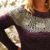 The piece begins in the round at the hips with a feather and fan lace border and continues in stockinette stitch through waist and bust shaping. Then, you work the sleeves to the underarms where you join them with the body to make the little kitty face lace yoke and ribbed neckline.