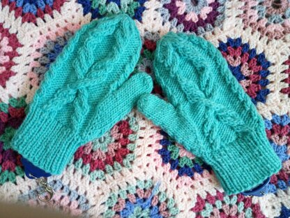 The edging is ribbed (K1, P1) and can be made longer for a double thick folded cuff which will be snuggly warm around the wrists on cold days, and stop draughts. There are charts (and written instructions). Sizing is achieved by using smaller or larger needles. It is possible to make a Large size mitten using 5mm or 5.5mm to achieve an XL. The only adjustment you’ll need to make is the length of the thumb to suit the recipient which could be longer or shorter. I made a medium for myself and shortened the thumb for my smaller hands. Worked cuff to fingertip, in the round using your preferred method of circular knitting. I used magic loop.