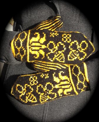I finally made the bee mittens of my dreams! I wanted to name these "Covered In Bees" after the Eddie Izzard [skit][1] but some clever Ravelers beat me to that name. Instead, the name comes from a phrase I used to say to my roommates All. The. Time. I can't remember how it started. It's a good question to ask, though.