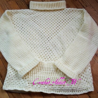 Good evening ladies, If I'm not mistaken this was my third sweater in getting to know yarn and stitches. Let's just say I'm very pleased with the outcome. The yarn used was Caron Simply Soft. The body is 2 Granny Squares joined together and continued on from there. In saying all that, any sock weight yarn would work nicely with this project as well. The size of the squaresare according to your size. Therefore, its easily customizeable.