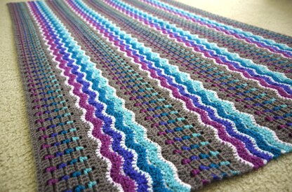 The Whispering Waves Afghan features a soft wavy stripe pattern. Give your afghan a unique look by choosing your favorite yarns and color palette.