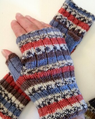 Self Patterning sock yarns make these fun and easy to knit and the yarn is not bulky making Whistler easy to wear whenever there is a chill in the air. Best of all!!! your fingers are left free while your hands stay warm!