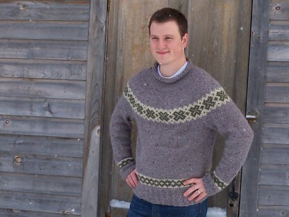 A simple yoked sweater designed to appeal to the basic style sense of men. Garter ribbing trims the hem and cuffs. Above the ribbing stranded color work diamonds complement the main clover pattern at the yoke. This sweater is designed to be plain enough for men while still being interesting to knit.