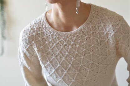 ”White Lizard” is a circular yoke pullover with a gradually growing rhombic pattern. You can choose the sleeve length from two options – 3/4 or long. It is worked from the top down seamlessly. The yoke is worked in the round with Lizard pattern, and short rows are worked to make the back longer than the front. The lower body is knit in one piece in the round. Sleeves stitches, set aside at the underarm, are worked down in the round to 3/4 or full length.