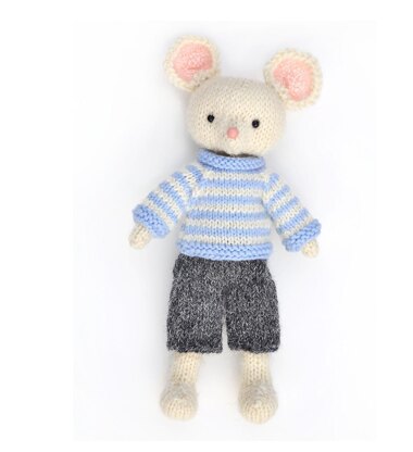 “White mouse Peter” toy is knitted in the round on 4 double-pointed needles in stockinette stitch and will be 20 cm 8 inches tall when finished.The sweater is worked on two needles in pieces and later seamed. The pants are knitted in the round. The pattern is written as row-by-row description and contains helpful step-by-step photos for important parts.