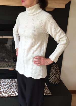 This lovely tunic length sweater is knit in the round from the bottom up in one piece. It is designed to fit loosely around hips. The turtleneck is added by picking up stitches at the neckline.