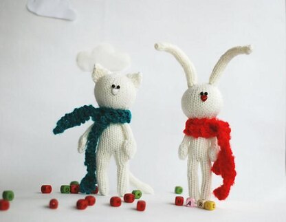 The finished rabbit is approximately 8,7 inches (22cm) tall. The finished cat is approximately 5,9 inches (15cm) tall. Pattern contains description how to knit rabbit, cat and their scarfs.