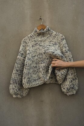 White sheep sweater is a short length style knit with mock neck and long balloon sleeves decorated with short rib cuffs. The mock neck is super cute because it molds well around the neck and it looks very feminine. It is worked top-down and sleeves with the body are worked in Fisherman rib stitch. Because sweater body is worked straight it can be easily made longer and of course, more yarns should be purchased. White sheep sweater is a fashionable jumper that fits well with high waist jeans or shorts.