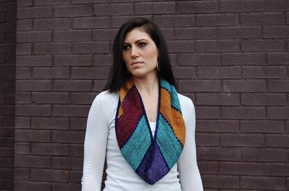 Whitman Sampler may not be a chocolate confection, but it is a knitted one. Two separate garter stitch strips are knit on the bias and then joined together with a three-needle purl bind off. Decorative rolled stockinette edges are picked up and knit in the round to complete the cowl. Each strip begins with two cast on stitches, which are increased into a triangle, followed by stripes and borders. The pattern is written out and includes coloring schematics so you can try out colors before committing to them on the needle. If you can knit, pick up and knit, bind off and knit in the round, this will be a fairly easy project for you. The three-needle purl bind off is fully explained.