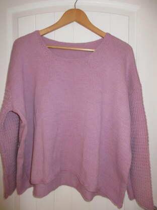 This is a pattern for a Wide Bodied Jumper, originally published in Knitting magazine. It has a wide body, slim dropped shoulder sleeves. The back and front are in stocking stitch and the sleeves in a simple knit/purl pattern. There is no sleeve shaping at the top.