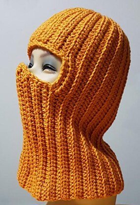A wide ribbed style balaclava with a peak in the front to cover the nose of the wearer.