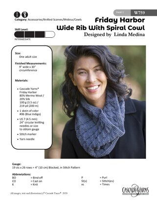 Wide Rib With Spiral Cowl in Cascade Yarns Friday Harbor - W759 - Downloadable PDF is a free Intermediate Knitting pattern by Linda Medina, available as a Downloadable PDF and includes instructions in English. Super fun to make, this pattern could be your next masterpiece!