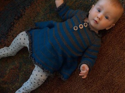 I love knit dresses for little girls, but was having trouble finding one that was pretty without being overly girly or frilly. Width Play has pairs of stripes that gradually change width down the dress, which keeps it interesting to knit but still fairly simple, and the picot edging at the collar, sleeves and neck keeps the dress feminine. The dress is knit in one piece from the collar down, with the sleeves being put on hold and worked at the end after the body is complete. Width Play has a flared skirt, and is shorter than many dresses, making it easier for little girls to crawl. It looks great paired with cute tights or leggings!