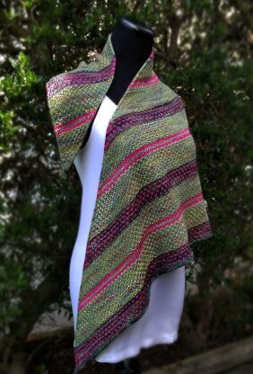 This light-weight shawl is an asymmetrical triangle, with enough color and texture incorporated to make this a delightfully fun knit. The shawl is worked flat with an increased stitch on every right side row.