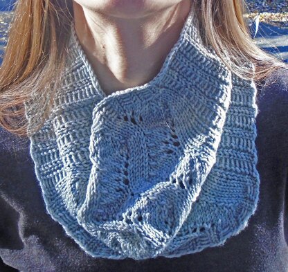 A viney lace motif and slipped stitches work together to create this pretty cowl. It can be knit with DK weight yarn for a lighter, more delicate piece, or worsted weight yarn for a larger cowl with an extra serving of cozy. This cowl is tapered to sit well on your shoulders. This is a very straightforward pattern and is a rewarding way to practice and improve your lace knitting skills.
