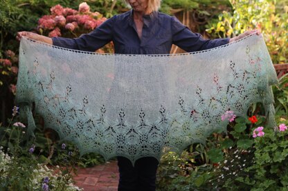 This shawl is worked from the top / neck edge down to the lace border, and features both cable and lace stitches. (but not a great many cable stitches). I used a 3.75 mm circular needle, and a 4 mm cable needle for the cables. Lace is worked on both right and wrong side rows and you will need to be able to read a chart to complete the pattern.