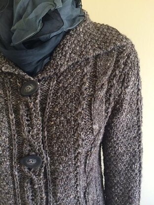This long cardigan is fun to wear and with frilly cuffs and hem. It is worked from the bottom up and is charted with schematics. The bulky weight yarn knits quickly despite the long length. The marbled colors of Inca Tweed gives the sweater depths and produces a garment you can be proud of. It is soft, warm, cozy yet breathable with the lace columns and blended fibers. Finished measurements are for the blocked pieces. Selvedges stitches are included in pattern, but not included in finished measurements.