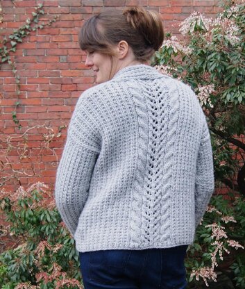 Willow is a cozy Spring jacket or cardigan with a simple allover broken rib pattern and a pretty (and easy) cable and lace panel up the back.The yarn is soft and wooly and lovely to knit with, and the bulky gauge makes for a very quick knit! The body is worked from the bottom up, the stitches sleeves are picked up and worked down in the round, the only seaming is at the shoulders and back of the collar and the patch pockets.